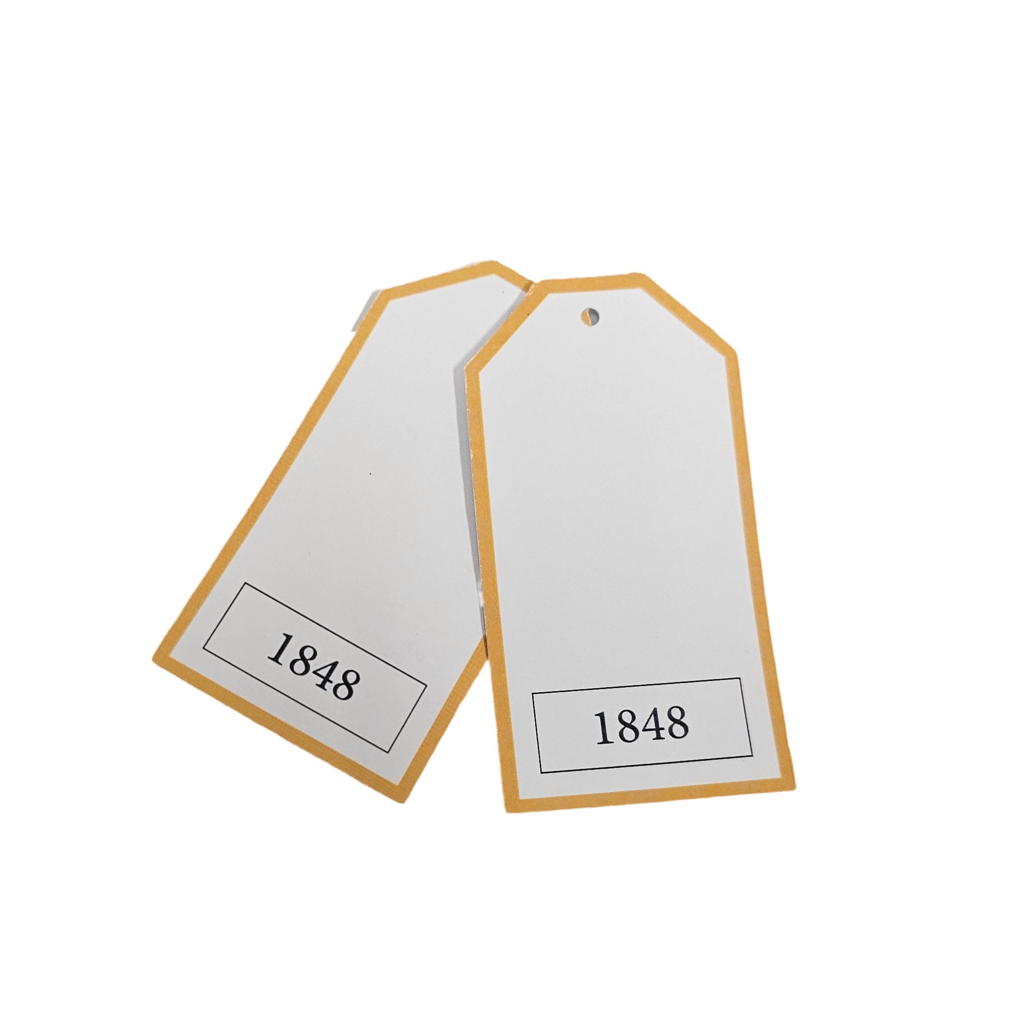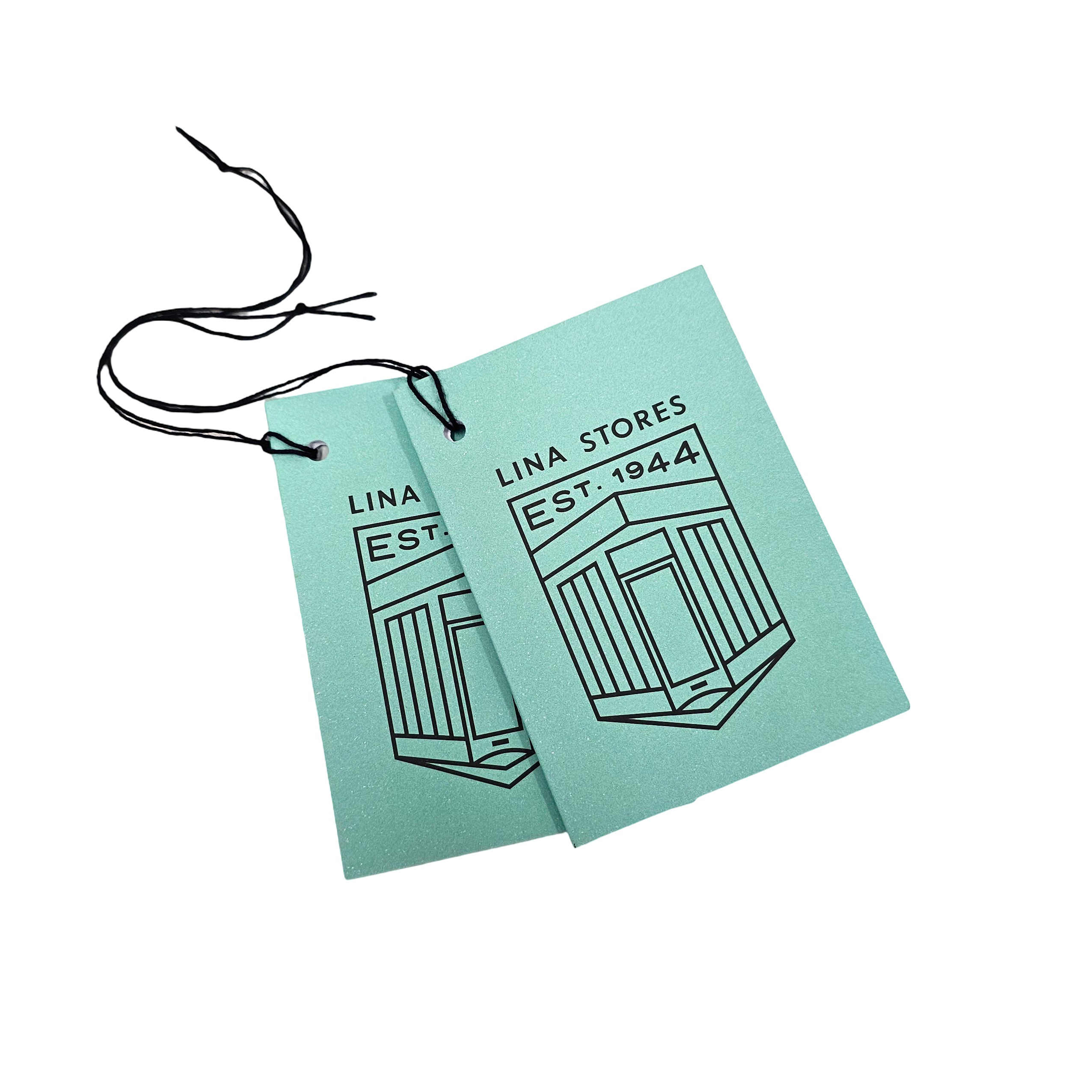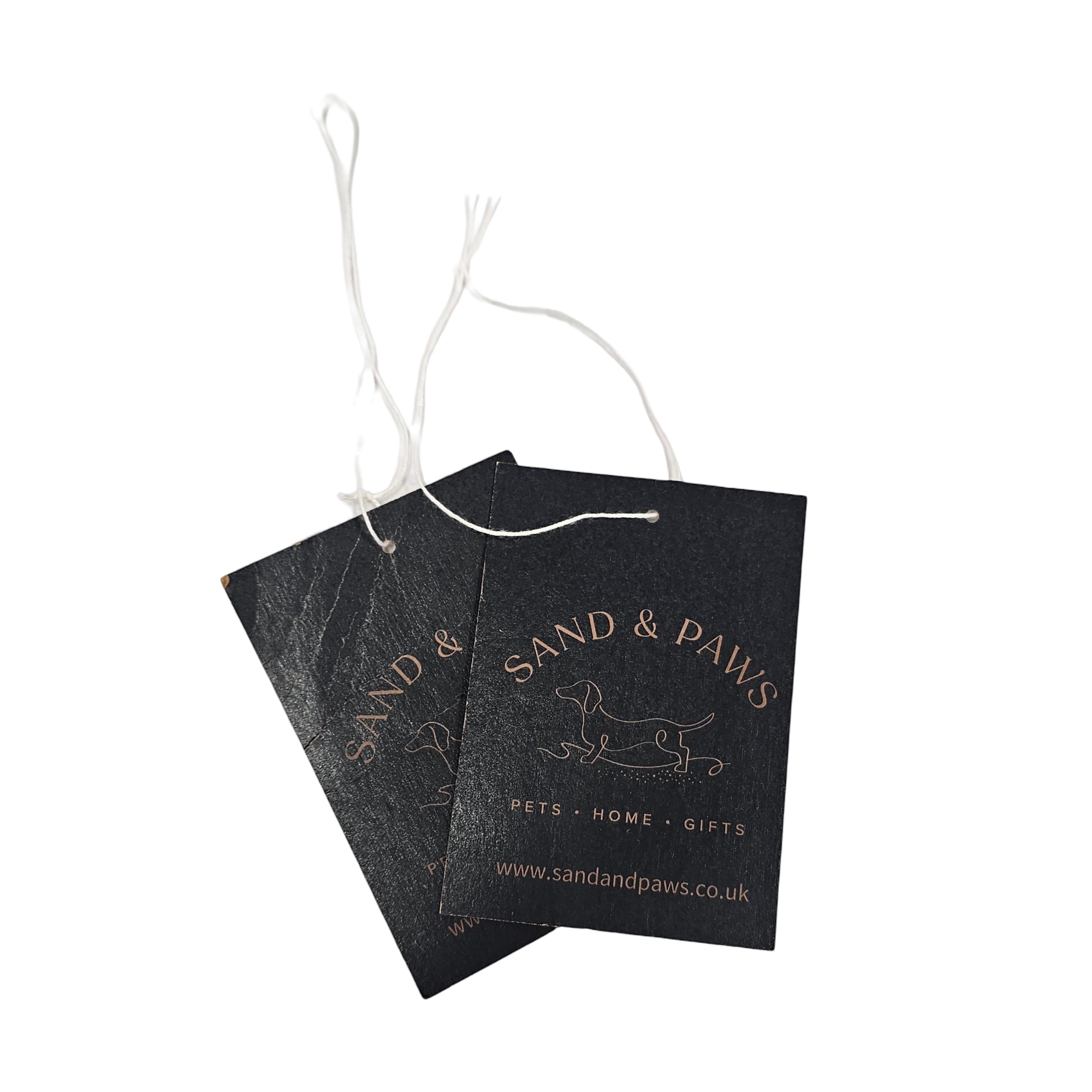 W40mm x L60mm rectangle tags, with 3mm drill hole, CMYK printed onto uncoated 400gsm card and finished with a stock cotton thread, knotted in a loop so the tag can pass through.