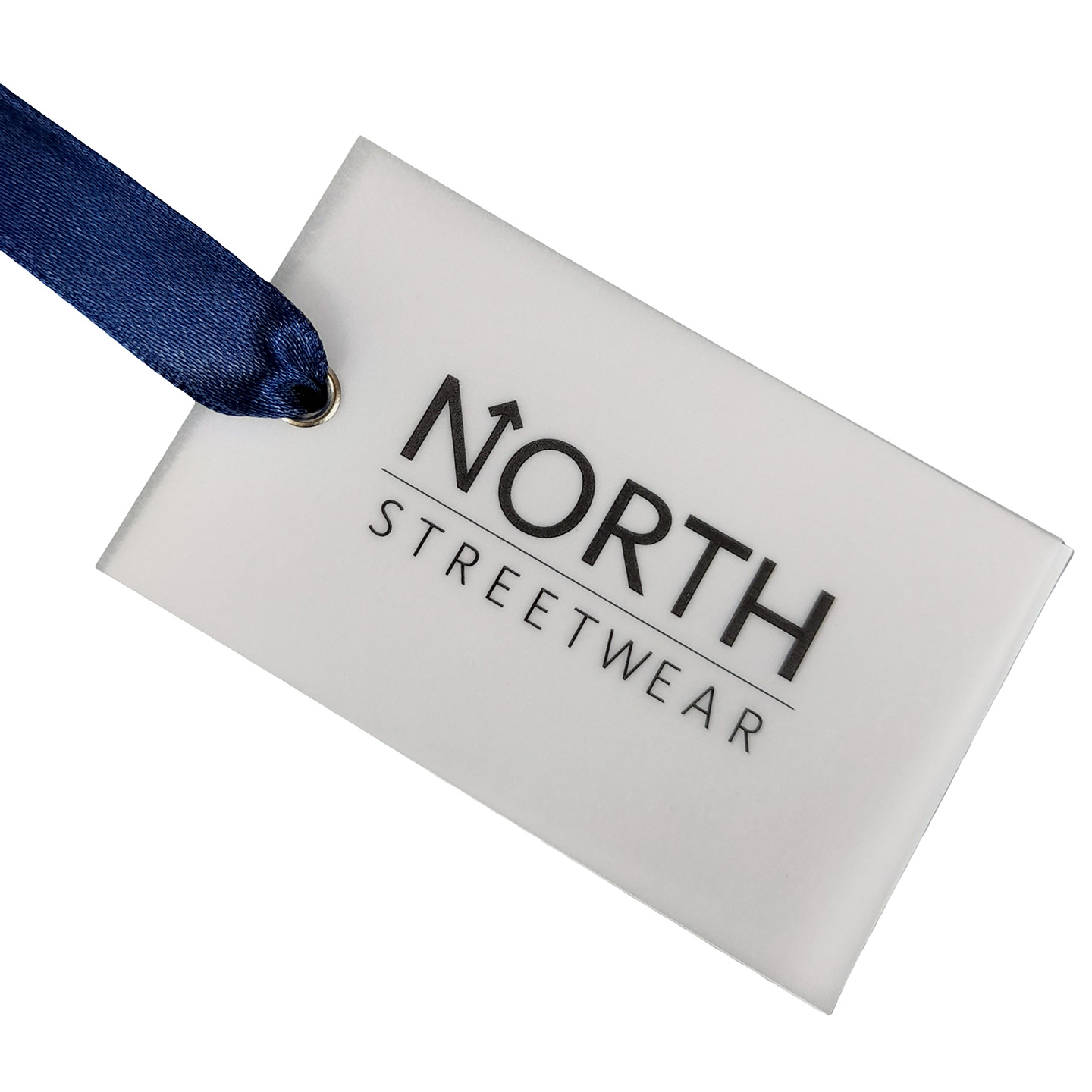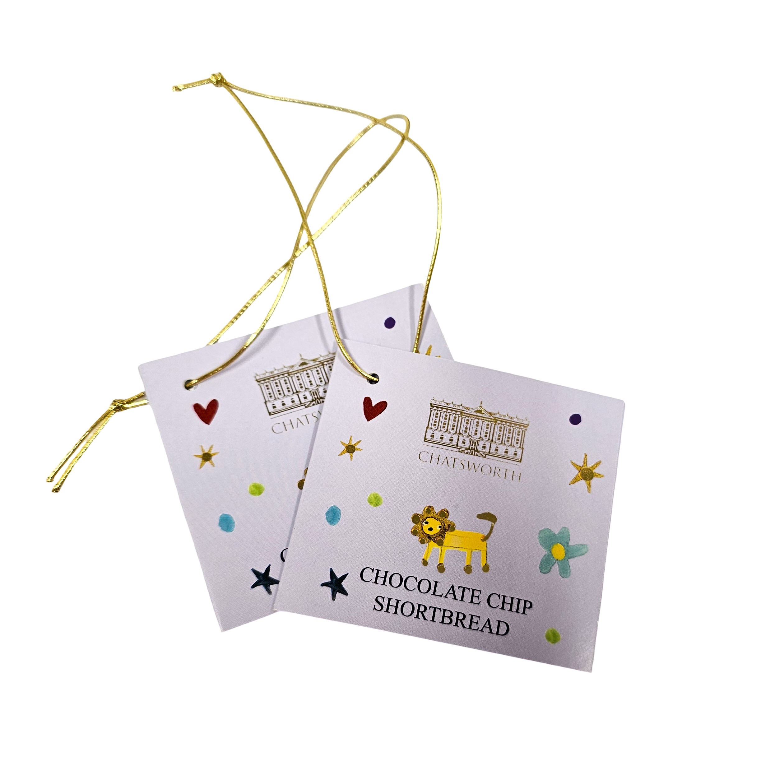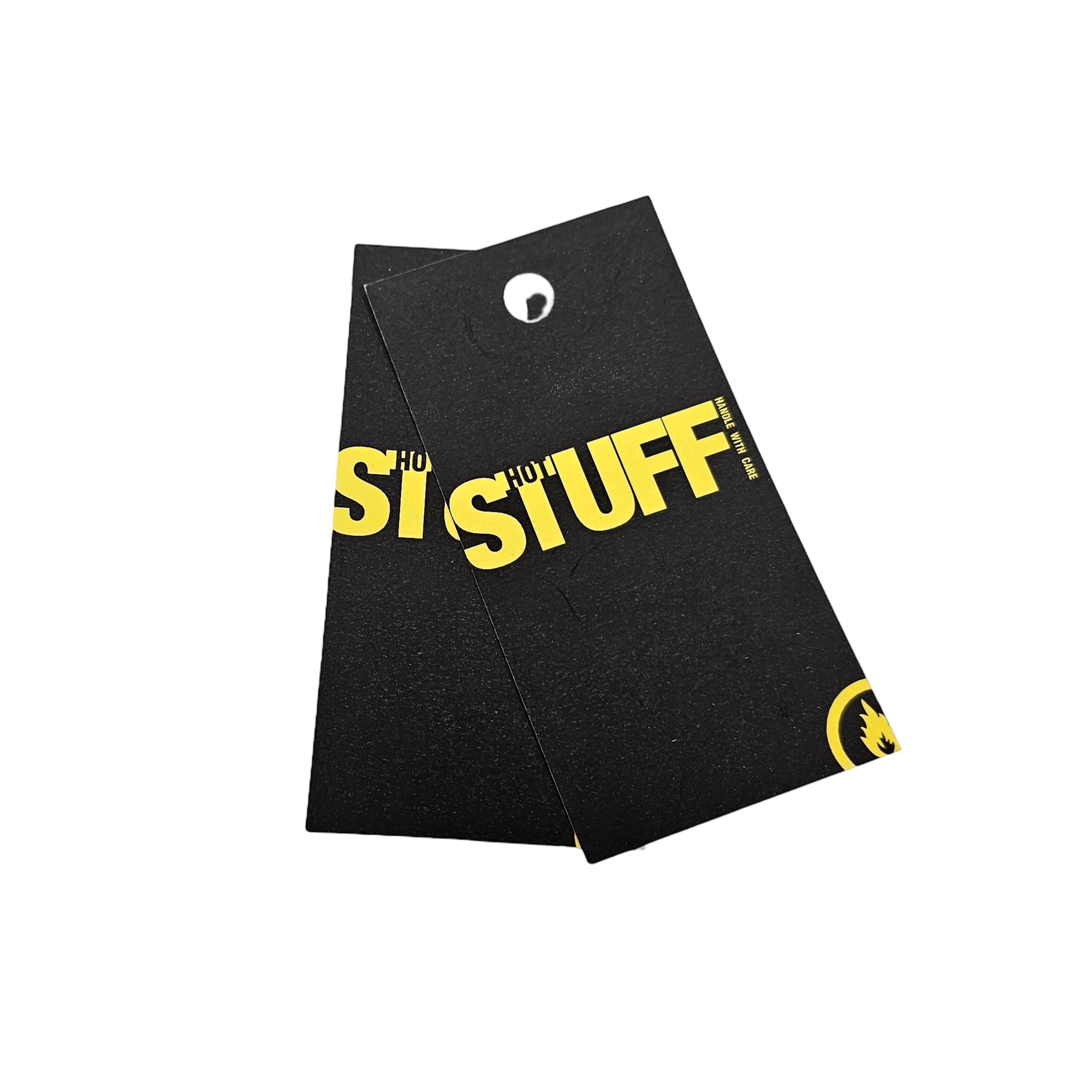 W40mm x L60mm rectangle tags, with 3mm drill hole, CMYK printed onto uncoated 400gsm card and finished with a stock cotton thread, knotted in a loop so the tag can pass through.