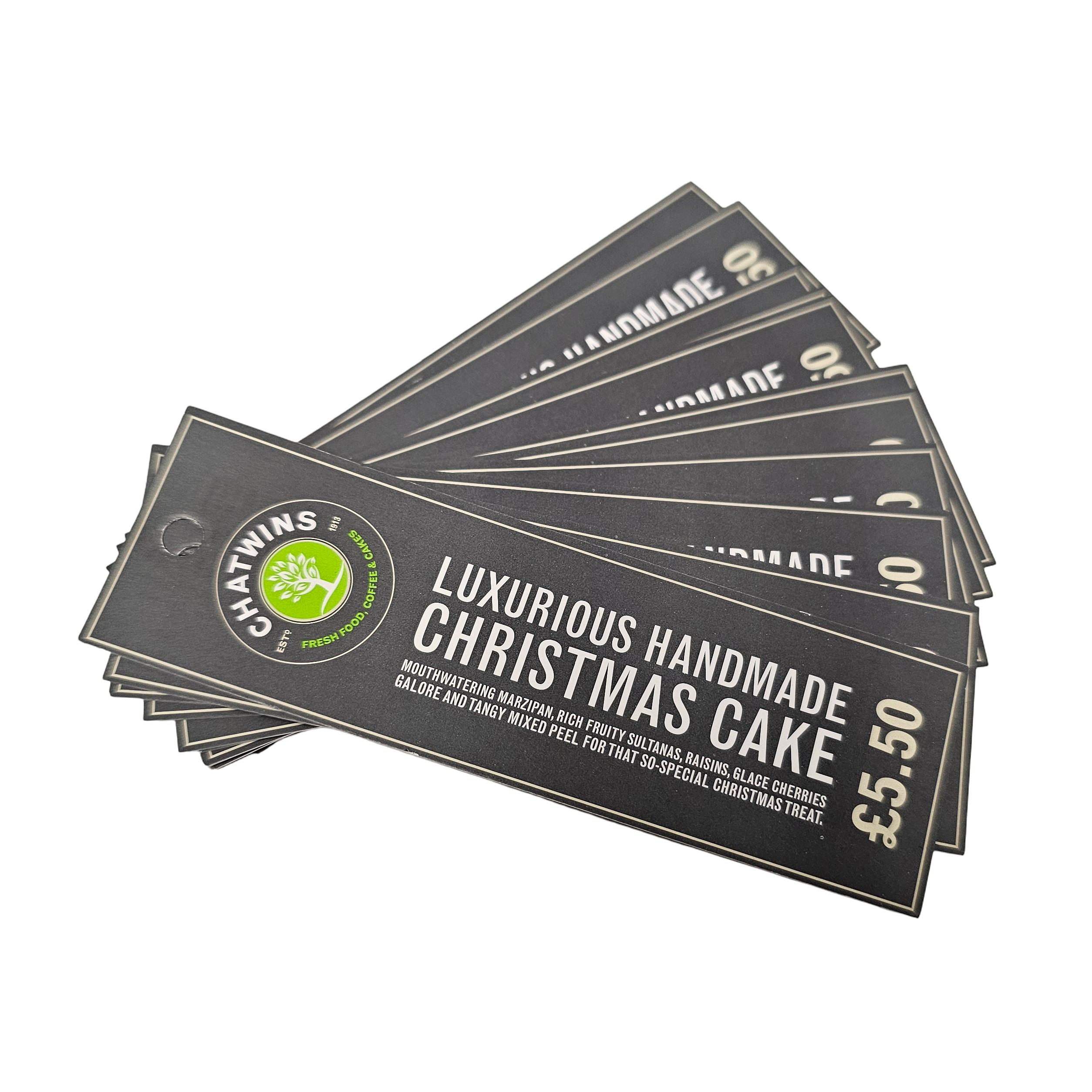 FSC accredited board and printers and a whole host of environmental choices mean that these tags can be as eco-friendly as needed. Finishes such as lamination or foiling will lessen the eco-credentials somewhat due to the extra processing needed during recycling.
