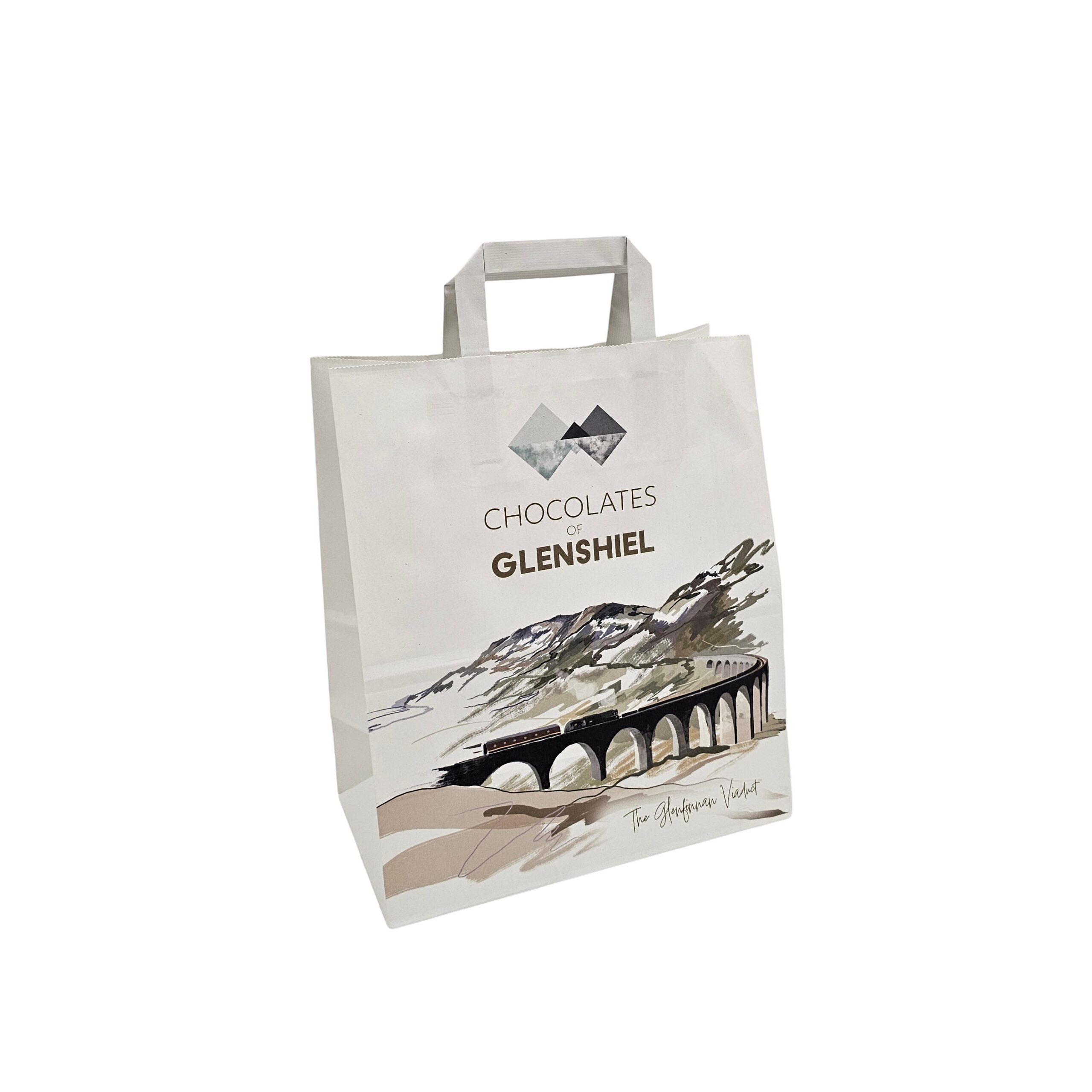 We offer a choice of internal fixed flat paper tape handles or SOS bags without any handles. As this is a new product our initlal introductory size is 260mm wide + 140mm side gusset / base x 305mm high which is very popular with food takeaways and delis. Made using 80gsm white or brown kraft paper and printed CMYK full colour process on one or both faces, edge to edge. As the bags are digitally printed we can split the designs over a larger quantity, without extra costs. For example order 250 x 4 designs = 1000 bags and benefit from the 1000 rate. Why not ask friends and neighbours to club together with you and everyone wins?!