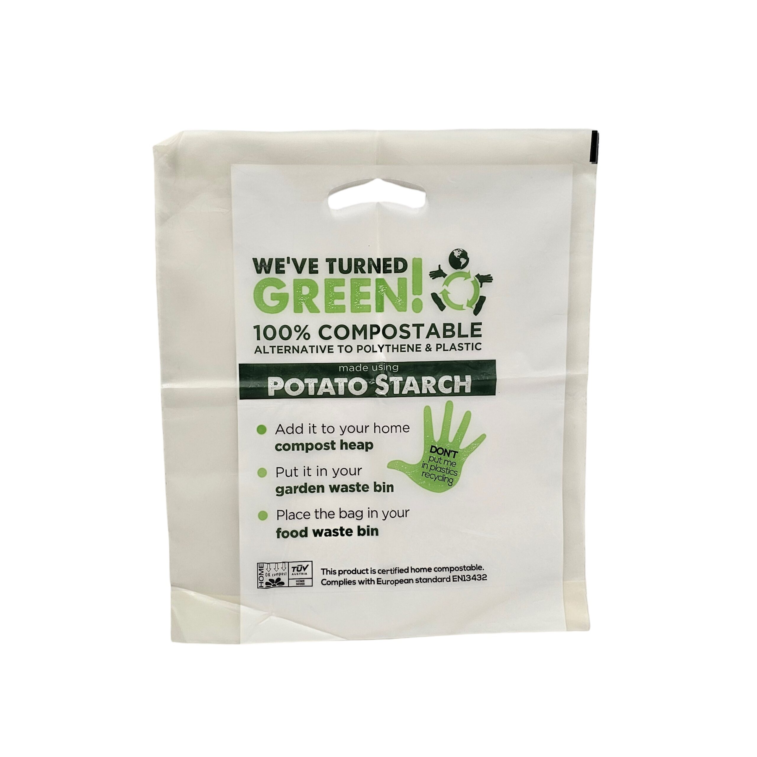 As a sustainable crop, Potato Starch carrier bags offer fabulous front end environmental credentials. What’s more, the inks used are water based and are non toxic.