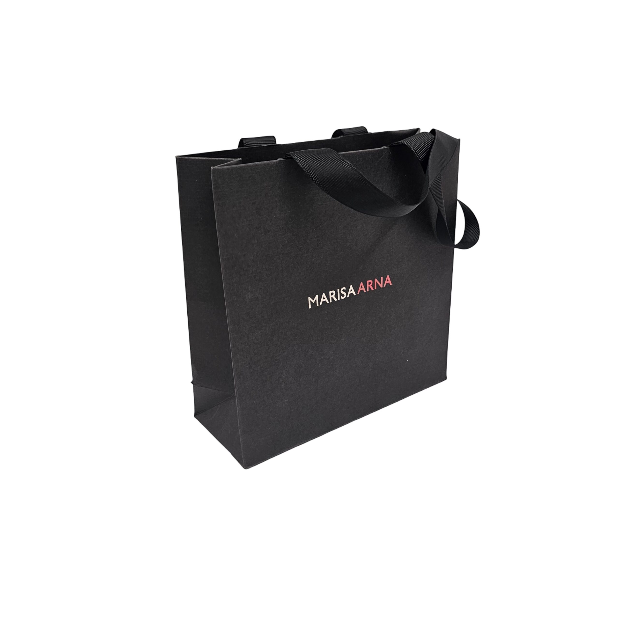 170gsm white kraft paper with all over ink coverage up to CMYK and a water based varnish, finished with 2cm wide x 45cm long knotted grosgrain ribbon handles.