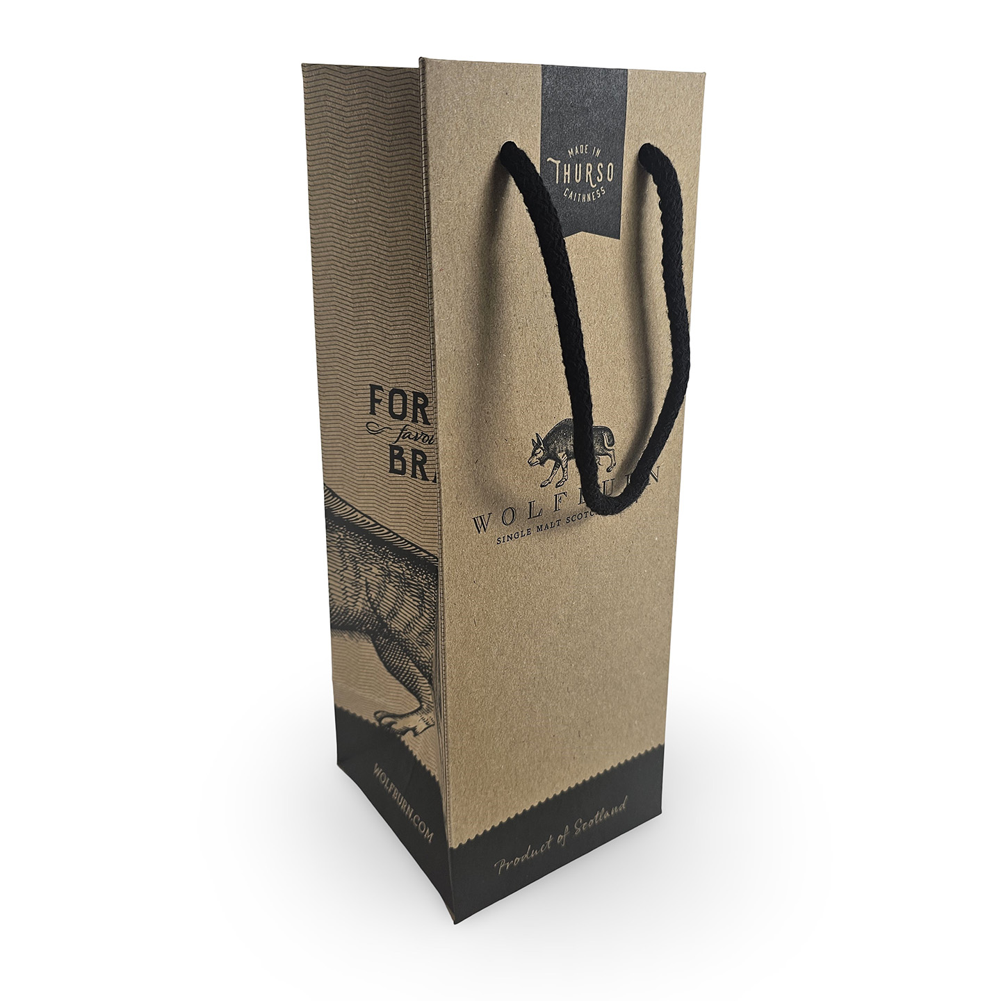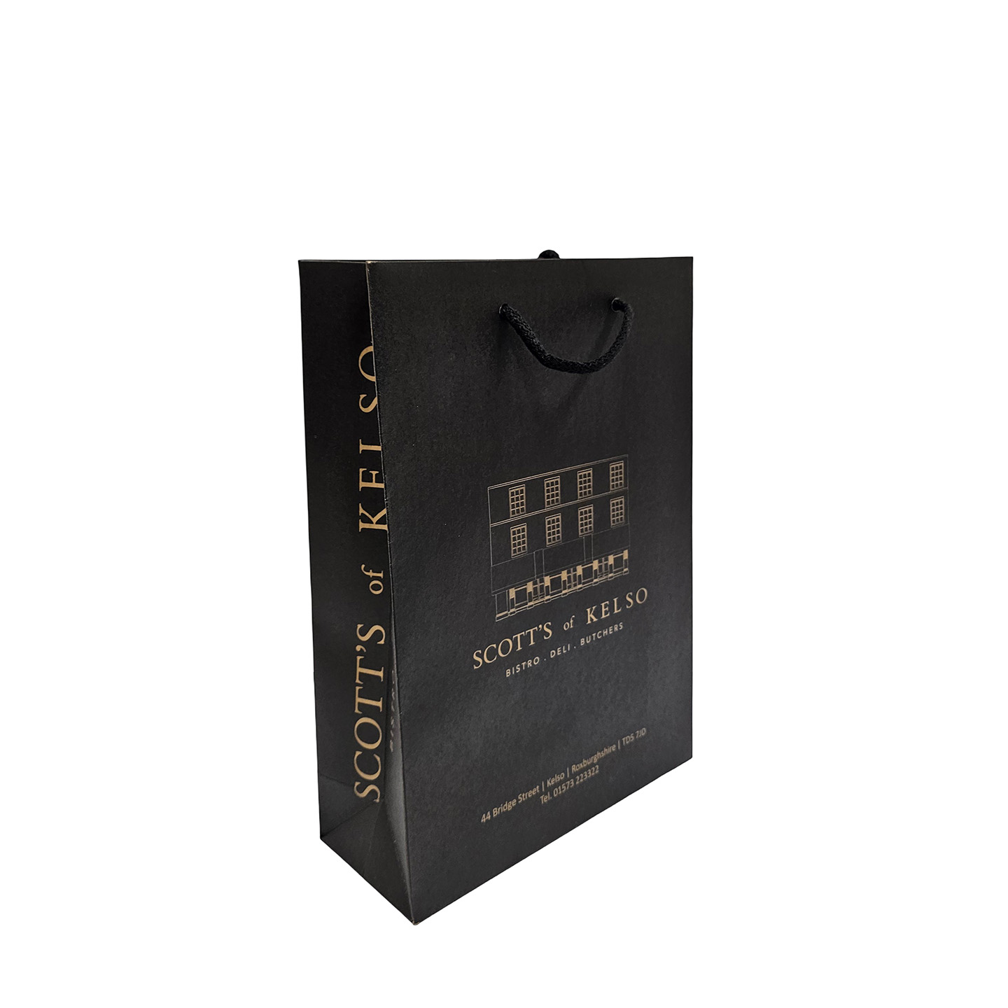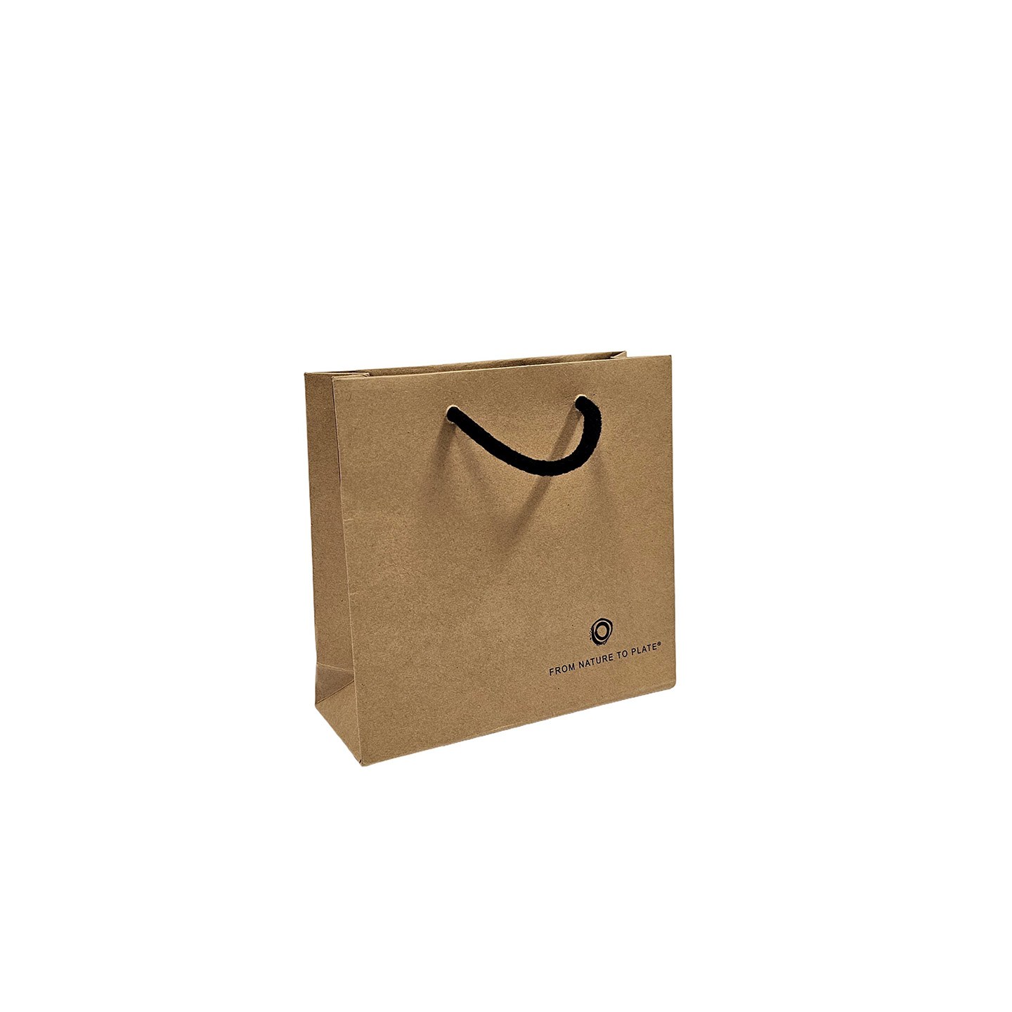 W25cm + G10cm x H35cm 200gsm brown kraft paper bags with coloured cotton rope handles, fitted base and handle cards.
