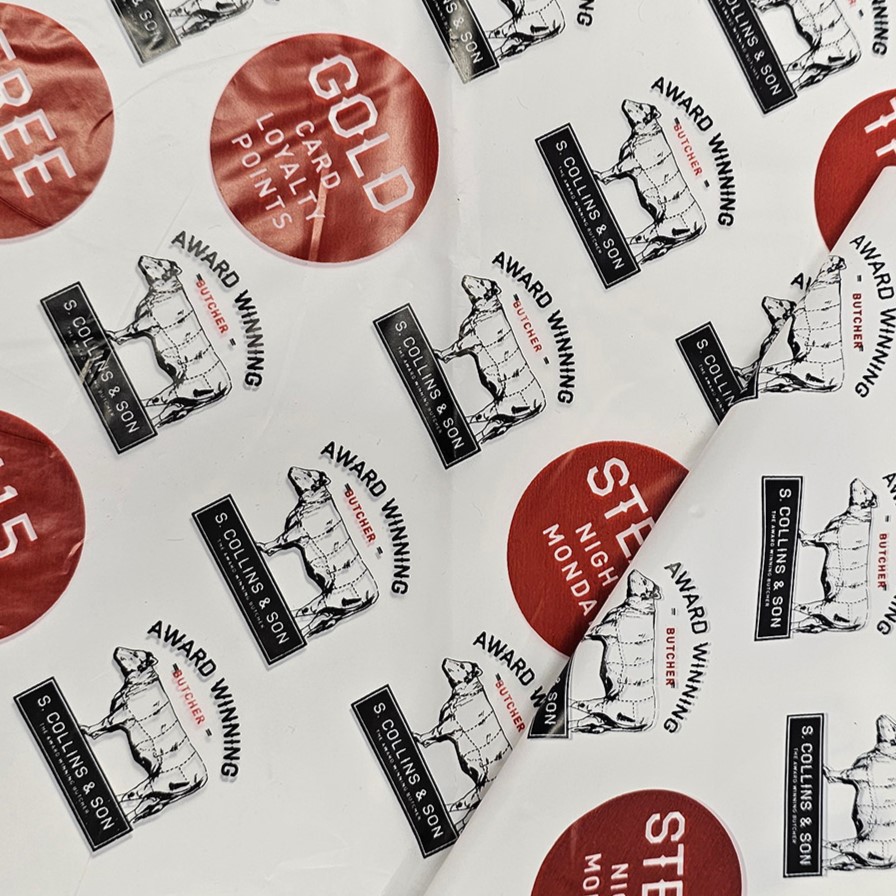 HDPE food grade sheets are popular with butchers in particular as they offer peace of mind, particularly when wrapping uncooked raw meats with high moisture. They are super to use to line mail order boxes or use as a box topper, offering a damp proofing layer within the box. These food grade HDPE sheets can be branded up to 3 ink colours and are suitable for direct contact with food.