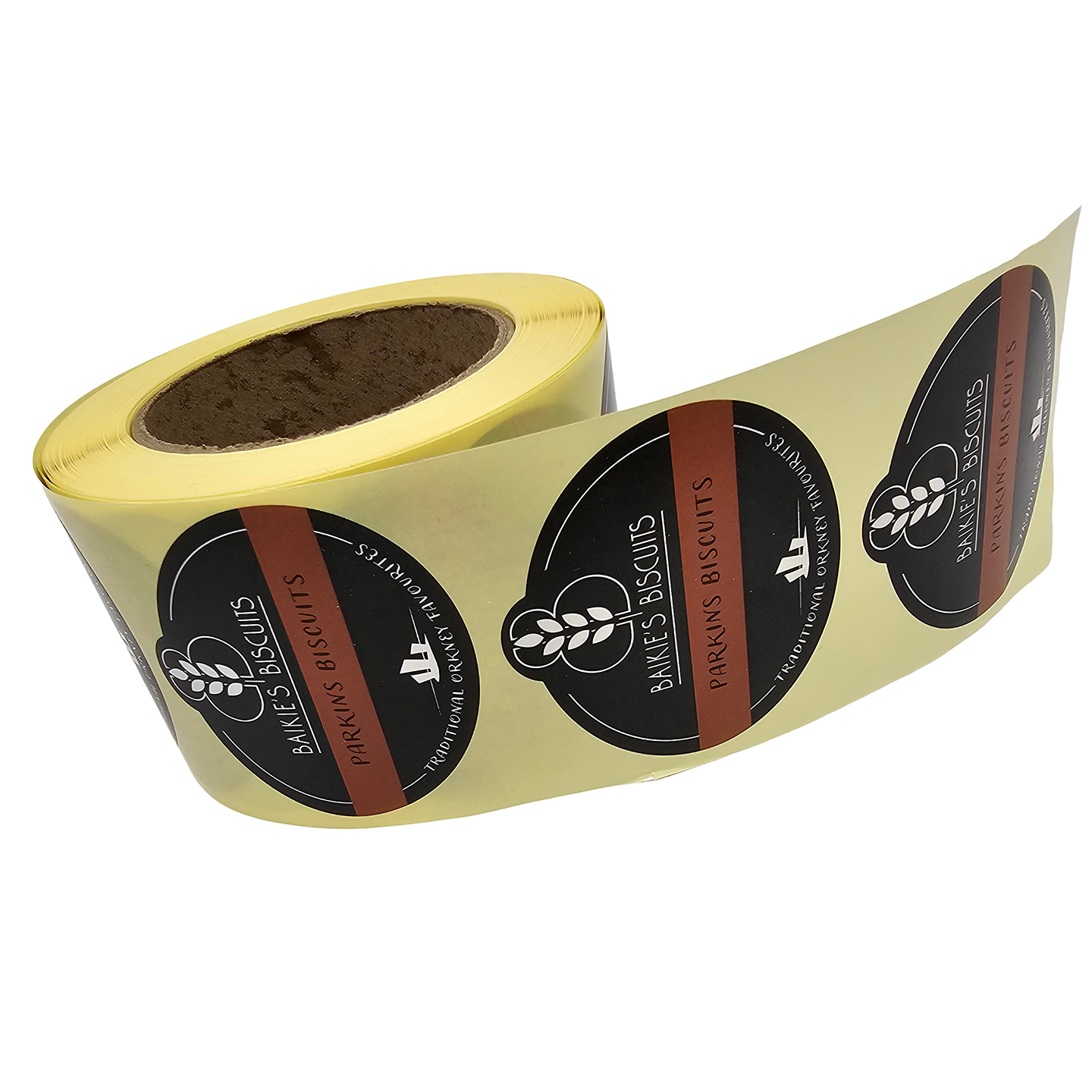 POPULAR STICKER 5cm diameter circle, semi gloss FSC paper or clear PP with a CMYK digitally printed design. 1000 per roll.